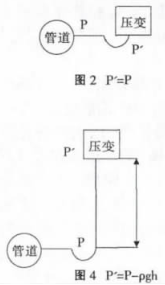 建議采用圖2的安裝方式,如不得已需要選擇圖3、圖4的安裝方式一定要對(duì)壓力進(jìn)行補(bǔ)償。不建議按照?qǐng)D5的方式安裝,因?yàn)闊o(wú)法確定P'與P的關(guān)系。