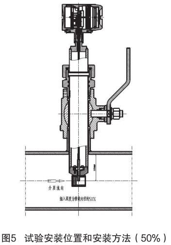 對(duì)插入式煙氣流量計(jì)和插入式電磁流量計(jì)的結(jié)構(gòu)原理進(jìn)行分析,插入式電磁流量計(jì)的信號(hào)采集點(diǎn)在標(biāo)校管道內(nèi)12.5% 為宜,因它屬電磁類(lèi)流量計(jì),而煙氣流量計(jì)是根據(jù)“卡門(mén)渦街”原理進(jìn)行測(cè)量管道內(nèi)流量,根據(jù)標(biāo)校管道內(nèi)層流和湍流的分析,以及插入式煙氣流量計(jì)獨(dú)特的探頭結(jié)構(gòu)形式,確定插入式煙氣流量計(jì)的插入深度為標(biāo)校管道內(nèi) 50%,試驗(yàn)安裝位置和安裝方法如圖 5 所示。
