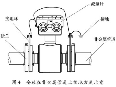 智能型防腐電磁流量計(jì)安裝在金屬管道上,安裝時(shí)將金屬管道與智能型防腐電磁流量計(jì)相連接,接地線(xiàn)再接入接地網(wǎng),如圖 3 所示。