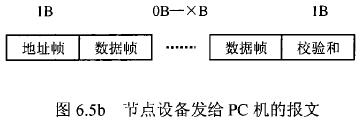 在花生油流量計(jì)等節(jié)點(diǎn)設(shè)備和C機(jī)通信的過(guò)程中,由地址幀、命令幀、數(shù)據(jù)幀、校驗(yàn)和可組成各種功能不同的報(bào)文。由于采用主從工作方式來(lái)實(shí)現(xiàn)通信,花生油流量計(jì)等節(jié)點(diǎn)設(shè)備僅能接收并執(zhí)行PC機(jī)發(fā)送來(lái)的控制命令,而不能發(fā)送命令給PC機(jī)。因此,由PC機(jī)發(fā)往流量計(jì)等節(jié)點(diǎn)設(shè)備的報(bào)文一般包括一個(gè)地址幀,一個(gè)命令幀,若干個(gè)數(shù)據(jù)幀和一個(gè)校驗(yàn)和,其報(bào)文格式圖.6a5所示;而由流量計(jì)等節(jié)點(diǎn)設(shè)備發(fā)往PC機(jī)的報(bào)文一般包括一個(gè)地址幀,若干個(gè)數(shù)據(jù)幀和一個(gè)校驗(yàn)和,其報(bào)文格式如圖6.5b所示。