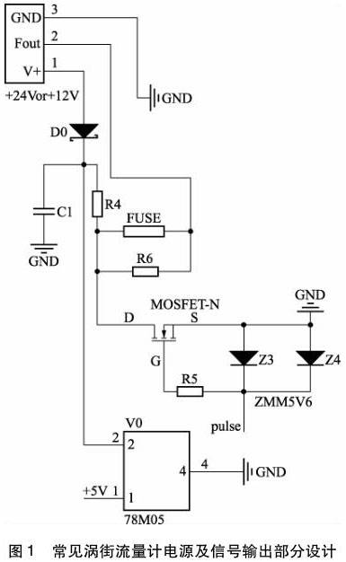 從圖1 中可以看到,供電電源 +24 V, +12 V均可,直流電源通過瓷片電容 C1 濾掉部分紋波,然后通過線性穩(wěn)壓芯片 78M05,得到 + 5 V 電壓,為后面的氯氣流量計(jì)信號處理電路供電,若要再得到 3. 3 V 電壓,通常會在 78M05 后再加一片線性穩(wěn)壓芯片 LM1117-3. 3,為了節(jié)約成本,供電電路沒有做 EMS 設(shè)計(jì)。同時(shí),脈沖輸出部分,僅通過一個(gè) MOS 管和兩個(gè)穩(wěn)壓管,也沒有 EMS 方面的設(shè)計(jì)考慮。