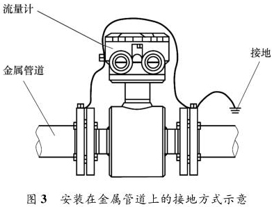 防腐型電磁流量計安裝在金屬管道上,安裝時將金屬管道與防腐型電磁流量計相連接,接地線再接入接地網(wǎng),如圖 3 所示。