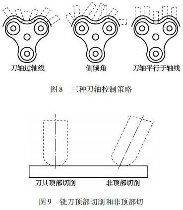 四軸加工中采用球頭銑刀,刀軸控制策略是提高加工效率和轉(zhuǎn)子曲面表面粗糙度的關(guān)鍵。如圖 8所示,刀軸控制策略有常見的刀軸過軸線、側(cè)傾角、刀軸平行于軸線。筆者采用平行軸線銑削加工方式對(duì)這 3 種刀軸控制策略進(jìn)行實(shí)際加工對(duì)比,得出采用側(cè)傾角刀軸控制策略加工出的轉(zhuǎn)子曲面表面粗糙度*好。其原因主要由于刀軸平行于軸線這種刀軸控制策略采用球頭銑刀加工時(shí),其刀具切削轉(zhuǎn)子曲面時(shí)的接觸點(diǎn)為刀具的頂部,球頭銑刀的頂部直徑為零,線速度也為零。此時(shí)刀具是在擠壓工件,刀具頂部也容易磨損。刀軸過軸線策略雖然刀具與轉(zhuǎn)子曲面的接觸點(diǎn)一直在變換,但是也有刀位點(diǎn)是采用刀具頂部去切削。側(cè)前傾角刀軸控制策略: 控制刀具與轉(zhuǎn)子曲面接觸點(diǎn)的位置,避免球頭銑刀頂部銑削轉(zhuǎn)子曲面,實(shí)現(xiàn)刀尖的點(diǎn)的偏離,提高刀具切削點(diǎn)的線速度。球頭銑刀頂部切削和非頂部切削如圖 9 所示。