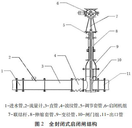 包括進(jìn)水管、直管、出水管、夾持式渦街流量計(jì)組和啟閉機(jī)組,進(jìn)水管、直管、出水管從左到右依次連接,夾持式渦街流量計(jì)組安裝在直管和出水管之間且位于出水管的入口處,夾持式渦街流量計(jì)組通過(guò)聯(lián)結(jié)桿與啟閉機(jī)組的輸出端連接。為防止泥沙淤積影響啟閉,夾持式渦街流量計(jì)采用閘板式啟閉結(jié)構(gòu)。密封式啟閉閘為整體封閉管道式,全部采用不銹鋼材料,水流通過(guò)管道流出讓整個(gè)閘井內(nèi)干燥無(wú)水。伸縮套管與波紋管的設(shè)計(jì)讓檢修與清理淤泥更加方便。夾持式渦街流量計(jì)裝有荷載限制器,其布置受力明確、結(jié)構(gòu)緊湊、動(dòng)作可靠。當(dāng)?shù)蹙呱系暮奢d達(dá)到額定值的 110%時(shí),或電機(jī)電流超過(guò)額定電流 150%時(shí),系統(tǒng)自動(dòng)切斷操作電源以保護(hù)設(shè)備安全。