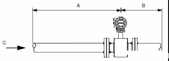 為了確保過程條件大幅度變化的情況下的規(guī)定精度,安裝傳感器時(shí),在電*平面上游留出至少五倍管徑長(zhǎng)度的直管段,在電*平面下游留出至少兩倍管徑長(zhǎng)度的直管段。