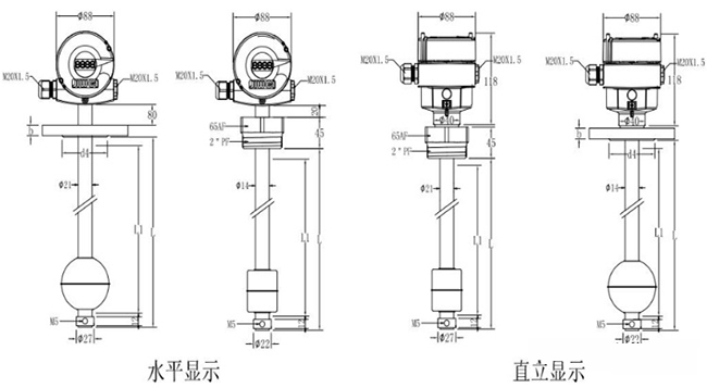 為更直觀地給用戶展現(xiàn)浮球式液位計(jì)的規(guī)格,請(qǐng)參考兩種浮球式液位計(jì)水平顯示以及直立顯示的不同規(guī)格尺寸,如下圖所示: