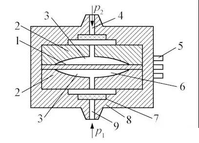 1—金屬膜片(動(dòng)*);2—凹玻璃圓盤(pán);3—金屬鍍層(定*);4—低壓側(cè)導(dǎo)壓口;5—輸出端子;6—空腔;7—過(guò)濾器;8—殼體;9—高壓側(cè)導(dǎo)壓口