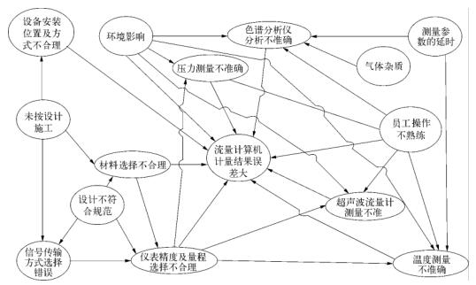 制藥廠污水流量計(jì)量系統(tǒng)計(jì)量的準(zhǔn)確性既與制藥廠污水流量計(jì)本體有關(guān),也和壓力、溫度測量儀表、色譜分析儀以及流量計(jì)算機(jī)等設(shè)備的可靠性有直接關(guān)系。此外,在員工操作、環(huán)境影響、設(shè)計(jì)選型、設(shè)備安裝等方面也會一定程度影響制藥廠污水流量計(jì)量的準(zhǔn)確性,其影響因素復(fù)雜多樣。電磁計(jì)量系統(tǒng)計(jì)量準(zhǔn)確性影響因素關(guān)聯(lián)關(guān)系如圖2所示。在實(shí)際生產(chǎn)應(yīng)用中,對制藥廠污水流量計(jì)量準(zhǔn)確性造成較大影響的主要是噪音、液體計(jì)量雜質(zhì)、氣體組分分析以及壓力、溫度測量這四個方面。
