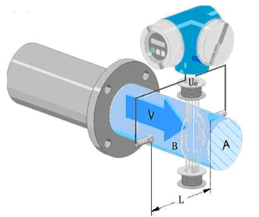 據(jù)法拉*電磁感應(yīng)原理,在與測(cè)量管軸線和磁力線相垂直的管壁上安裝了一對(duì)檢測(cè)電*,當(dāng)導(dǎo)電液體沿測(cè)量管軸線運(yùn)動(dòng)時(shí),導(dǎo)電液體切割磁力線產(chǎn)生感應(yīng)電勢(shì),此感應(yīng)電勢(shì)由兩個(gè)檢測(cè)電*檢出,數(shù)值大小與流速成正比例,其值為: