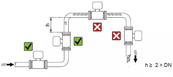 管路必須完全充滿液體。保證管路始終充滿液體至關(guān)重要,否則流量顯示會受到影響,而且還會出現(xiàn)測量錯誤。管路結(jié)構(gòu)的設(shè)計必須要保證測流管始終充滿流體。當(dāng)流體有分流或含有固體顆粒沉淀物時,建議使用垂直安裝。但采用垂直安裝時,要遵循流體從下到上的走向,以保證管路充滿流體。