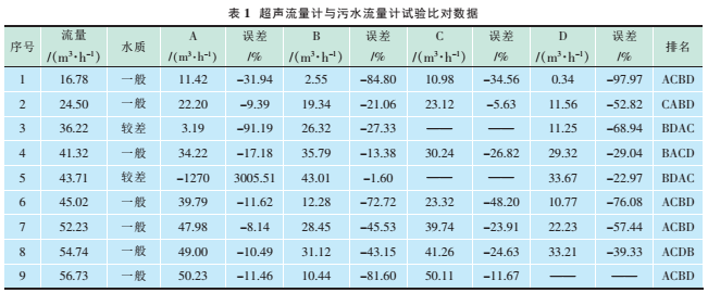 試驗數(shù)據(jù)見表1,其中流量表示污水流量計60min內(nèi)的累計流量;A、B、C、D分別為4個型號的超聲波流量計在60min內(nèi)的累計流量;排名為與同一臺污水流量計比對的4臺超聲波流量計的誤差按從小到大的順序。