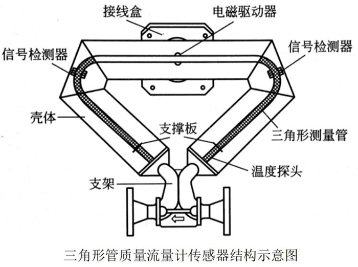 科氏力式質(zhì)量流量計(jì)運(yùn)用流體質(zhì)量流量對(duì)振動(dòng)管振蕩的調(diào)制作用為原理。傳感器由振動(dòng) 管(測(cè)量管)、信號(hào)檢測(cè)器、振動(dòng)驅(qū)動(dòng)器、支撐結(jié)構(gòu)和殼體組成,如下圖所示。