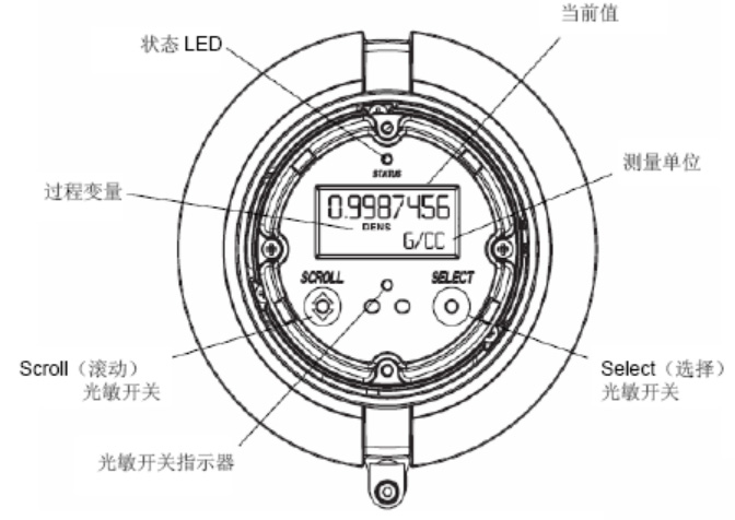 顯示器面板由一個(gè)用于顯示過(guò)程變量的液晶顯示器;一個(gè)用以指示質(zhì)量流量計(jì)的工作狀態(tài)的質(zhì)量流量計(jì)工作狀態(tài)LED 指示燈;兩個(gè)光敏按鍵<Scroll>和<Select>以及一個(gè)用于按鍵響應(yīng)指示的LED 燈組成。