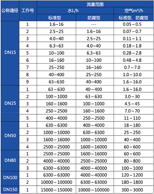 1、測(cè)量范圍:水(20℃)2.5-300000 l/h,空氣(20℃,0.1013MPa)0.07-3000m3/h 參見(jiàn)流量表,特殊流量可訂制